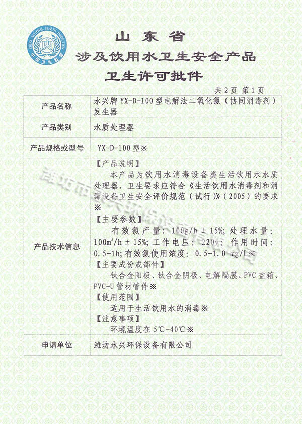 電解法二氧化氯發(fā)生器涉及飲用水衛(wèi)生許可批件--詳情說明
